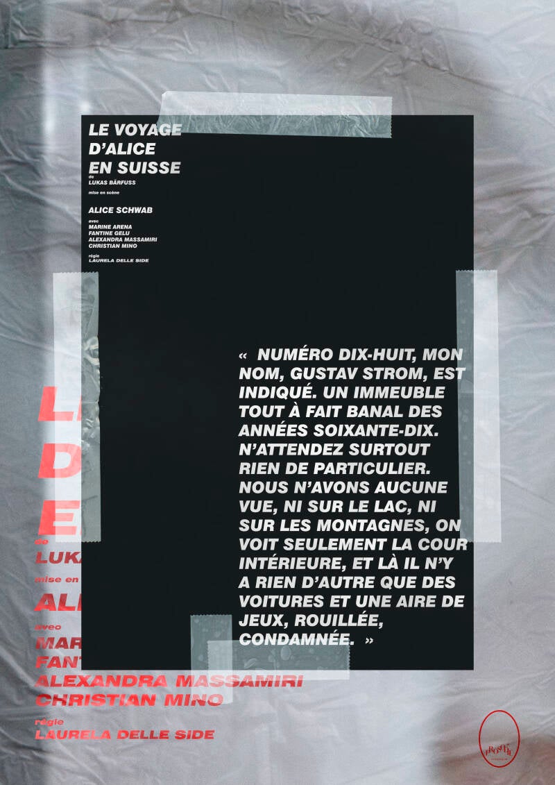 En septembre 2017, je découvre Le Voyage d’Alice en Suisse. Simple rapport à mon prénom. Lors d’un travail d’école, parcours d’un rôle, je travaille le personnage d’Alice. Rapidement, je m’attache aux personnages, à l’univers de l’auteur et au sujet de la pièce. Je décide de monter Le Voyage d’Alice en Suisse, en tant que metteur en scène et scénographe.